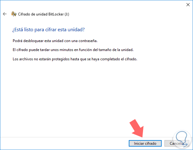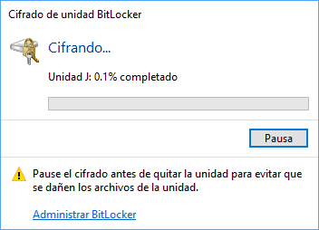 Como vemos, ya se han completado los pasos de configuración y resta pulsar en el botón Iniciar cifrado para comenzar el uso de BitLocker en la tarjeta SD: