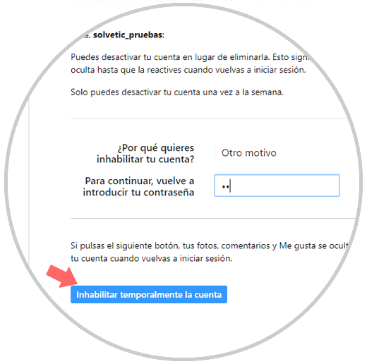 Instagram te preguntará los motivos por los que quieres desactivar la cuenta y te pedirá la contraseña. Una vez lo rellenes se activará el botón de “Desactivar temporalmente” mi cuenta en el que deberás pulsar.