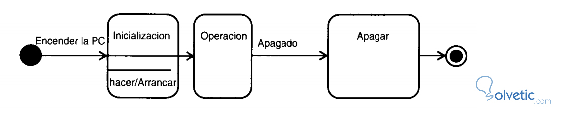 Empezamos con el encendido de la PC, esto hace que se desencadene un proceso de arranque, es decir, se desencadena un suceso que hace que se presente la interfaz de usuario, es decir, pasa por la transición desde la inicialización, en el caso del arranque es la acción que se ejecuta durante dicha transición.