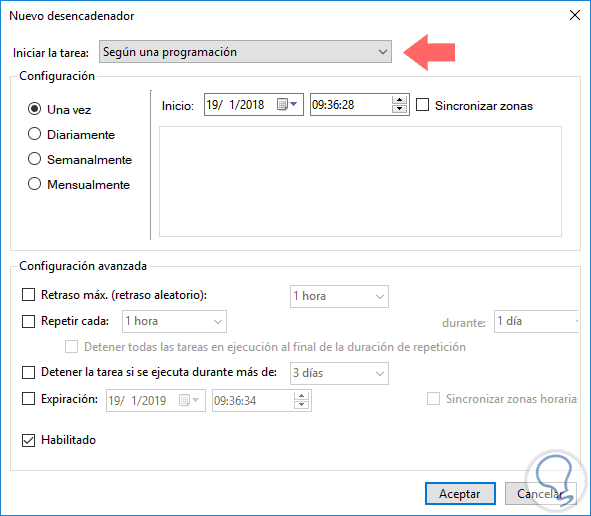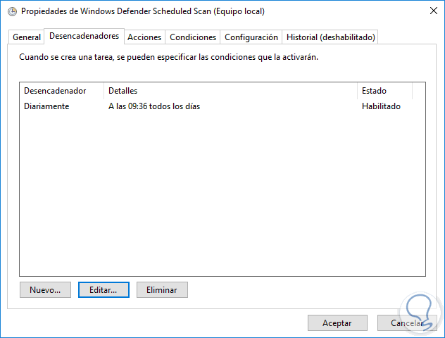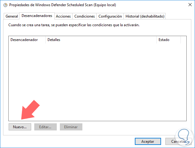 Allí podemos dejar la opción ya configurada, ahora vamos a la pestaña Desencadenadores y veremos lo siguiente: