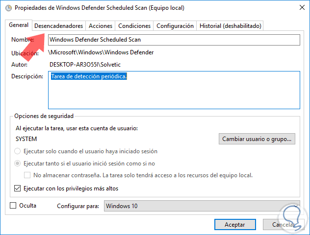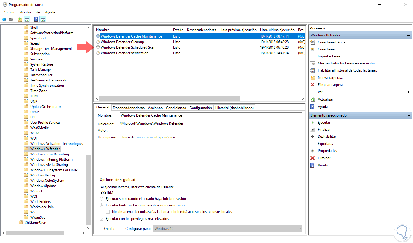 Allí daremos doble clic sobre la tarea llamada Windows Defender Scheduled Scan ubicada en el panel central y será desplegada la siguiente ventana.