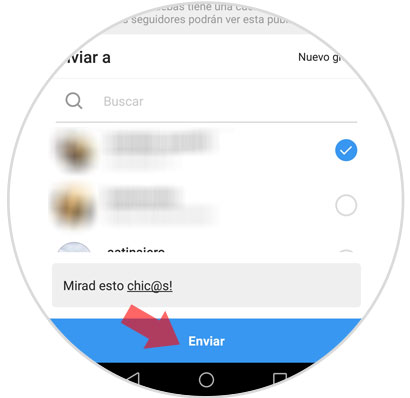 El grupo con varios contactos aparecerá como uno más. Selecciónalo y pulsa “Enviar”. Podrás introducir un mensaje que acompañe a la publicación en la barra inferior antes de enviar.