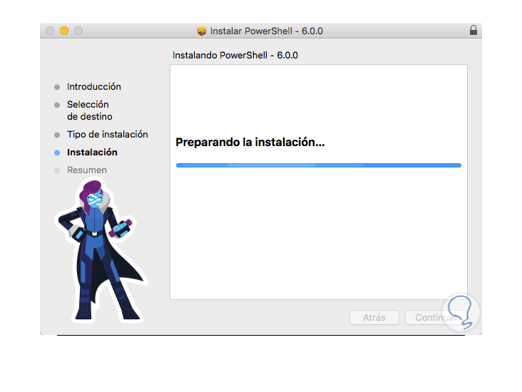 Alternativamente, podemos descargar el paquete powershell-6.0.0-rc-osx.10.12-x64.pkg del sitio web oficial y una vez descargado, daremos doble clic sobre el dónde se desplegará el siguiente asistente: