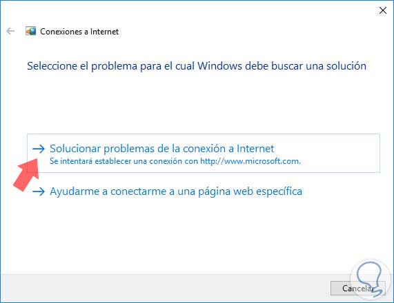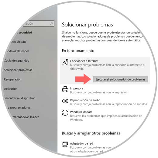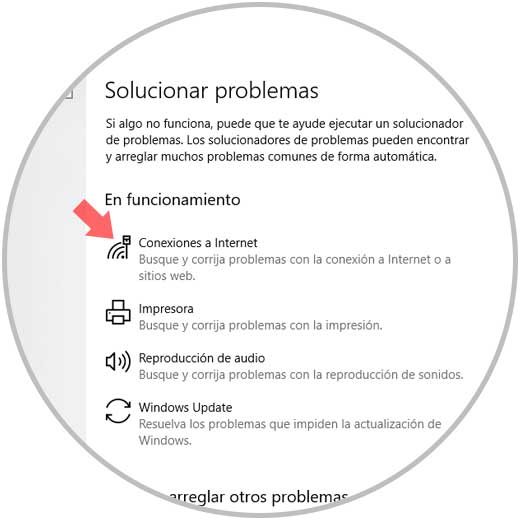 Allí pulsamos en la opción Conexiones a Internet y automáticamente será desplegado el botón Ejecutar el solucionador de problemas:
