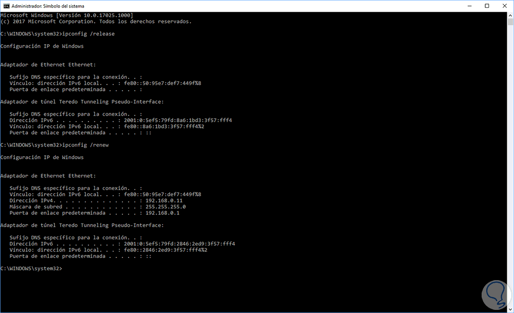 ipconfig /reléase (Libera la dirección IP actual)ipconfig /renew (Renueva la dirección IP)