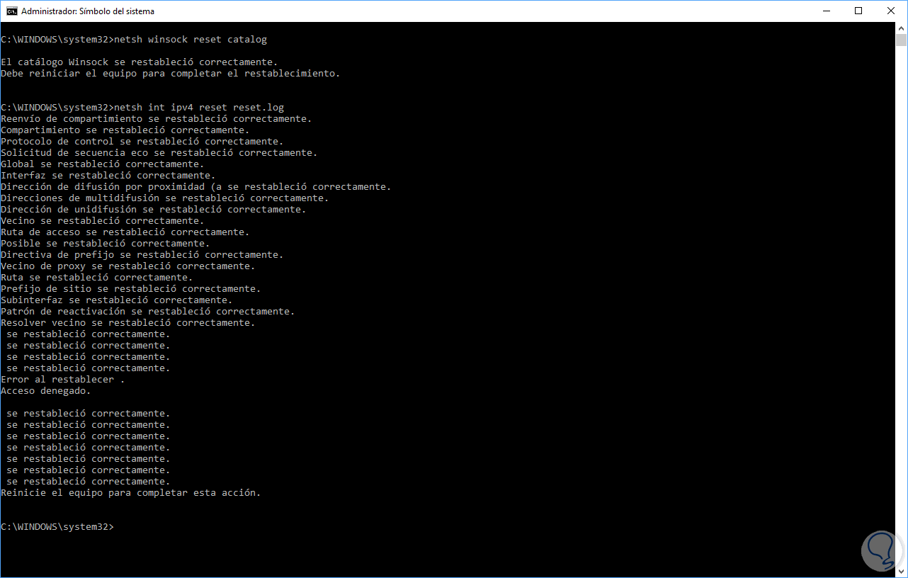 netsh winsock reset catalog (Restablece el catalogo Winsock) netsh int ipv4 reset reset.log (Restablece la configuración IPv4) netsh int ipv6 reset reset.log (Restablece la configuración IPv6)
