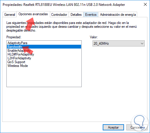 Pulsamos en el botón Configurar ubicado en la parte superior y en la nueva ventana desplegada vamos a la pestaña Opciones avanzadas y en la línea Bandwith seleccionaremos la opción más adecuada: