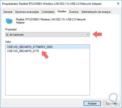 En caso de que esta opción no solucione el problema, daremos de nuevo clic derecho sobre el adaptador de red Wi-Fi y seleccionamos la opción Propiedades y vamos a la pestaña Detalles donde debemos seleccionar el campo Id. De hardware en la sección Propiedad y veremos lo siguiente:
