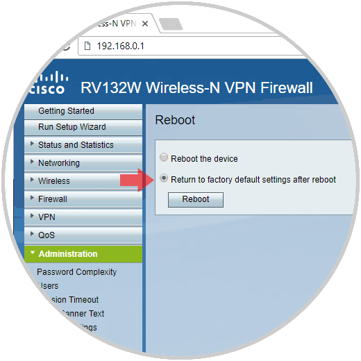 Una vez obtengamos la dirección IP de la puerta de enlace, la cual es por lo general 192.168.0.1, ingresaremos las credenciales y en la gestión del modem debemos ubicar la opción para restablecer el modem a sus valores de fabrica: