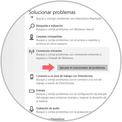 Otra de las opciones que podemos revisar con el solucionador de problemas es la línea Conexiones entrantes: