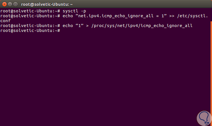 echo “net.ipv4.icmp_echo_ignore_all = 1” >> /etc/sysctl.conf