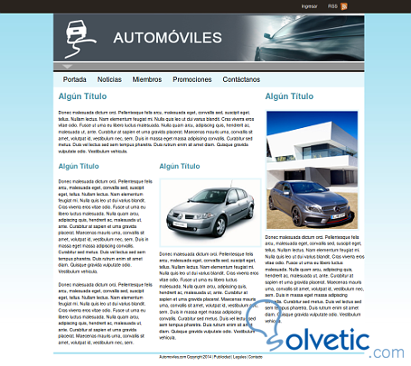 <!DOCTYPE html PUBLIC "-//W3C//DTD XHTML 1.0 Transitional//EN" "http://www.w3.org/TR/xhtml1/DTD/xhtml1-transitional.dtd"> <html xmlns="http://www.w3.org/1999/xhtml"> <head> <meta http-equiv="Content-Type" content="text/html; charset=iso-8859-2" /> <title>Automoviles </title> <link href="styles/960.css" rel="stylesheet" type="text/css" /> <link href="styles/reset.css" rel="stylesheet" type="text/css" /> <link href="styles/text.css" rel="stylesheet" type="text/css" /> <link href="styles/miestilo.css" rel="stylesheet" type="text/css" /> </head> <body> <div id="top"> <div class="container_12"> <div class="grid_3 prefix_9"> <ul> <li>Ingresar</li> <li id="rss">RSS</li> </ul> </div><!--grid_3--> <div class="clear"></div> </div><!--container_12--> </div><!--top--> <div class="container_12" id="bodyMain"> <div class="grid_12" id="header"> </div> <div class="clear"></div> <div class="grid_12" id="menu"> <ul> <li>Portada</li> <li>Noticias</li> <li>Miembros</li> <li>Promociones</li> <li>Contáctanos</li> </ul> </div><!--menu--> <div class="grid_12" id="contentMain"> <div class="grid_8 alpha"> <div class="articulo"> <h1>Algún Título</h1> <p> Donec malesuada dictum orci. Pellentesque felis arcu, malesuada eget, convallis sed, suscipit eget, tellus. Nullam lectus. Nam elementum feugiat mi. Nulla quis leo ut dui varius blandit. Cras viverra eros vitae odio. </p> </div><!--articulo--> <div class="grid_4 alpha"> <div class="articulo"> <h3>Algún Título</h3> <p> Donec malesuada dictum orci. Pellentesque felis arcu, malesuada eget, convallis sed, suscipit eget, tellus. Nullam lectus. Nam elementum feugiat mi. Nulla quis leo ut dui varius blandit. Cras viverra eros vitae odio. </p> <p> Donec malesuada dictum orci. Pellentesque felis arcu, malesuada eget, convallis sed, suscipit eget, tellus. Nullam lectus. Nam elementum feugiat mi. Nulla quis leo ut dui varius blandit. Cras viverra eros vitae odio. </div> <div class="grid_4 omega"> <h3>Algún Título</h3> <img src="images/imagen1.jpg" alt="auto nuevo" class="border-azul" /> <p> Donec malesuada dictum orci. Pellentesque felis arcu, malesuada eget, convallis sed, suscipit eget, tellus. Nullam lectus. Nam elementum feugiat mi. Nulla quis leo ut dui varius blandit. Cras viverra eros vitae odio. Fusce ut urna eu libero luctus malesuada. Nulla quam arcu, adipiscing quis, hendrerit ac, malesuada ut, ante. </p> </div> </div> <div class="grid_4 omega"> <h1>Algún Título</h1> <img src="images/imagen2.jpg" alt="Promociones" class="border-azul" /> <p>Donec malesuada dictum orci. Pellentesque felis arcu, malesuada eget, convallis sed, suscipit eget, tellus. Nullam lectus. Nam elementum feugiat mi. Nulla quis leo ut dui varius blandit. Cras viverra eros vitae odio. </p> </div> <div class="clear"></div> </div><!--contentMain--> <div class="clear"></div> <div class="grid_12 prefix_4" id="footer"> <p>Automoviles.com Copyright 2014 | Publicidad | Legales | Contacto</p> </div><!--footer--> </div><!--bodyMain--> </body> </html>