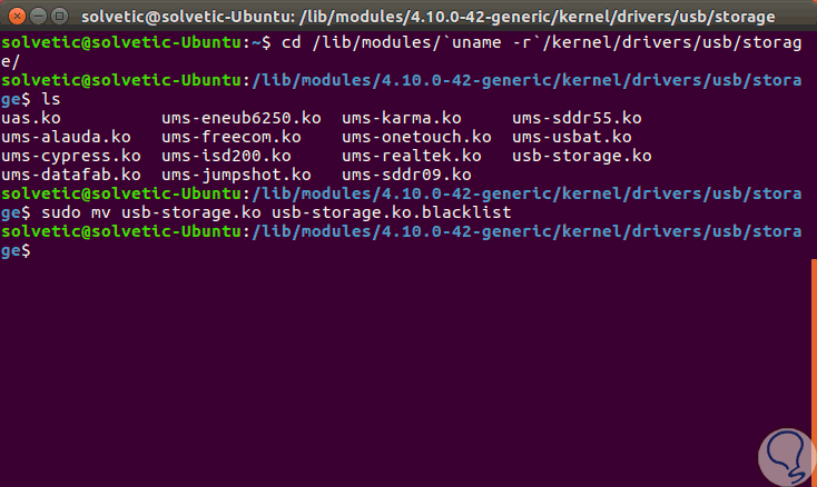 cd /lib/modules/`uname -r`/kernel/drivers/usb/storage/ ls sudo mv usb-storage.ko usb-storage.ko.blacklistDe este modo, cuando se conecte cualquier medio USB al equipo, el núcleo no podrá cargar el respectivo kernel de entrada de este controlador de almacenamiento.