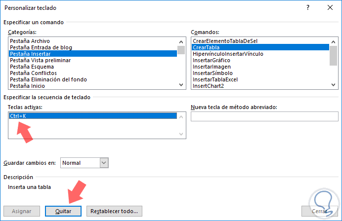 En el momento en que no deseemos hacer mas uso de esta secuencia, debemos ir nuevamente a las Opciones de Word y pulsar en el botón Personalizar, una vez allí, seleccionamos la combinación en el campo Teclas activas y pulsamos en el botón Quitar ubicado en la parte inferior: