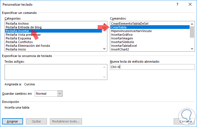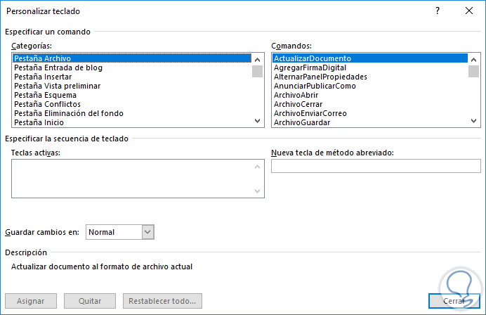 El siguiente paso a dar será seleccionar la categoría y el comando que debemos personalizar en Word 2016, una vez seleccionada, damos clic en el campo Nueva tecla de método abreviado y pulsaremos la secuencia de teclas en el teclado físico y automáticamente Word 2016 la detectará y la añadirá a este campo: