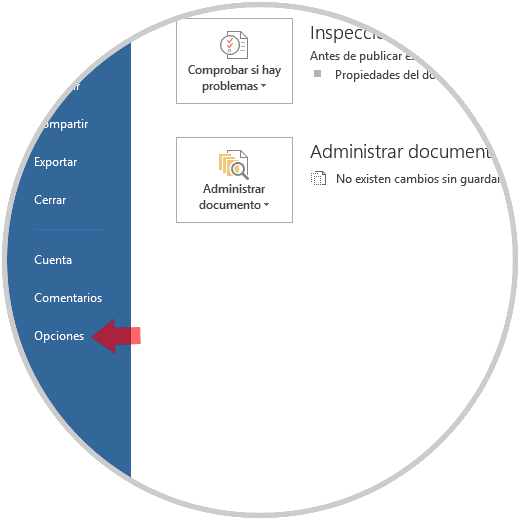 Para iniciar el proceso vamos a Word 2016 y nos dirigimos al menú Inicio y en las opciones desplegadas seleccionamos la sección Opciones: