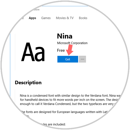 Allí podremos dar clic sobre la fuente deseada y pulsar en el botón Get (Obtener) para su descarga e instalación automática: