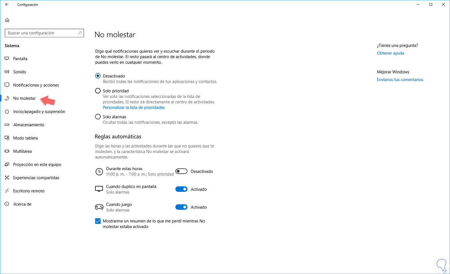 Allí tenemos las siguientes opciones en el campo “No molestar”: