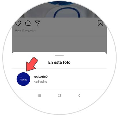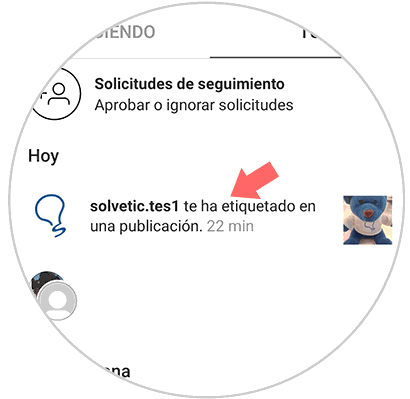 Primero recibirás una notificación en tu teléfono y pulsando sobre ella accederás a la imagen en Instagram. Pulsa sobre la notificación en Instagram donde te dan el aviso de la etiqueta