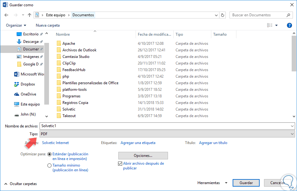 En la ventana que será desplegada, definimos la ubicación donde será guardado el documento y en el campo “Tipo” desplegamos las opciones disponibles y seleccionamos “PDF”: