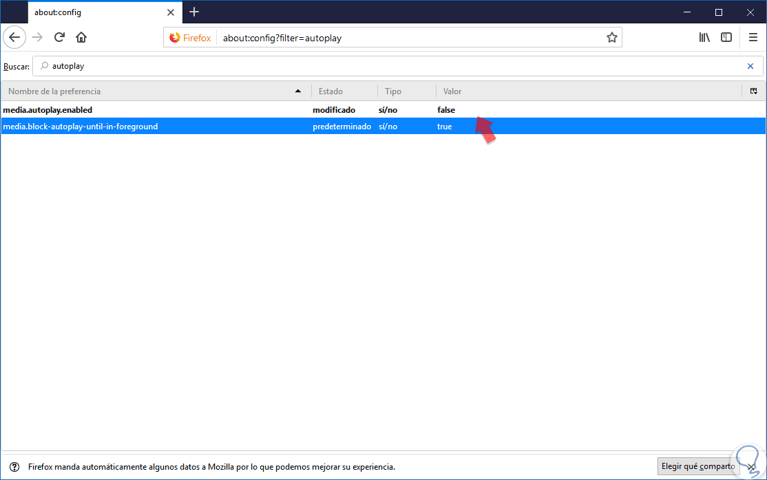 Haz clic derecho- modificar sobre la opción de "media.autoplay.enabled" y cámbialo de True a False. Vemos cómo cambia el formato a negrita ya que es el estilo que adquieren las propiedades modificadas. Si bien ves que hay otra opción podremos dejarla en True.