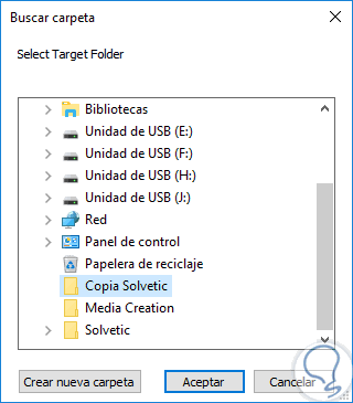 En este recuadro, será necesario que indiquemos la ruta donde se han de guardar los archivos que serán copiados, podemos seleccionar una carpeta existente o crear una nueva. Una vez seleccionada la carpeta, pulsamos en Aceptar y veremos lo siguiente: