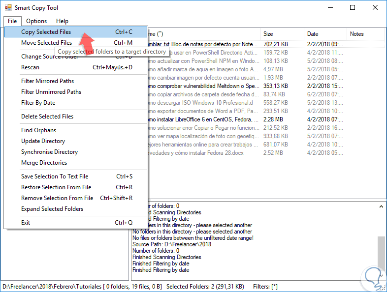 - Ir al menú “File” y allí seleccionar la opción “Copy Selected Files”