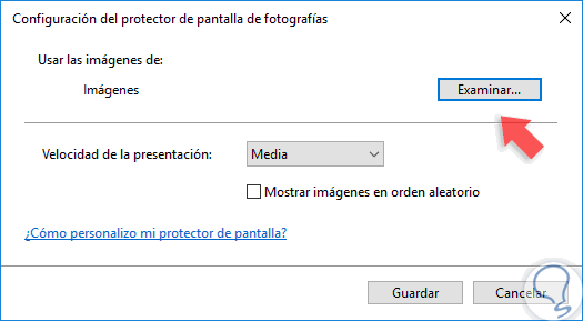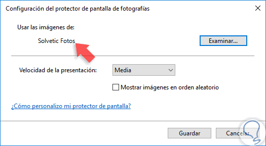 Allí vemos el origen de las imágenes y podemos definir la velocidad con la cual estas serán ejecutadas, para añadir nuestras propias fotos, pulsamos en el botón “Examinar” y seleccionaremos la carpeta deseada: