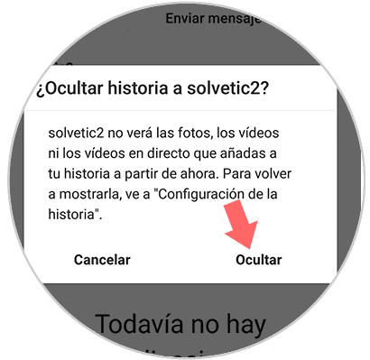 Finalmente una vez que hemos seleccionado esta opción, tenemos que confirmar esta acción a través de un nuevo cartel emergente en el que se nos informa de que si ocultamos nuestras historias a ese contacto, ya no verá las fotos o vídeos que subamos a nuestras historias.