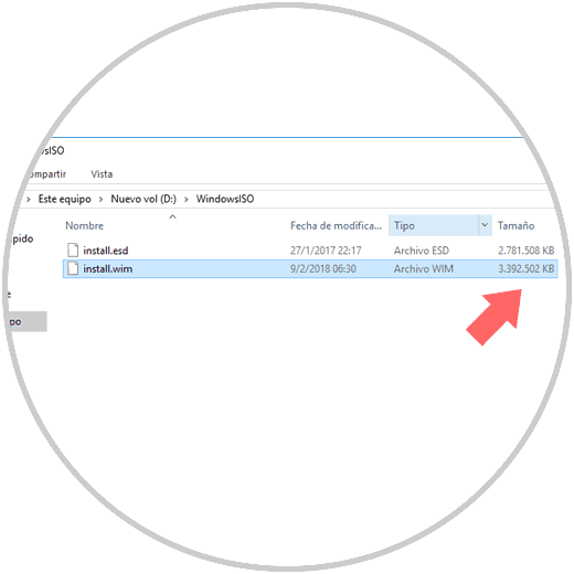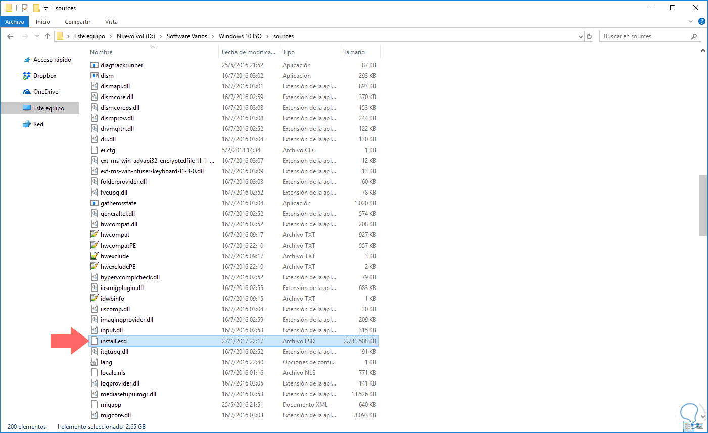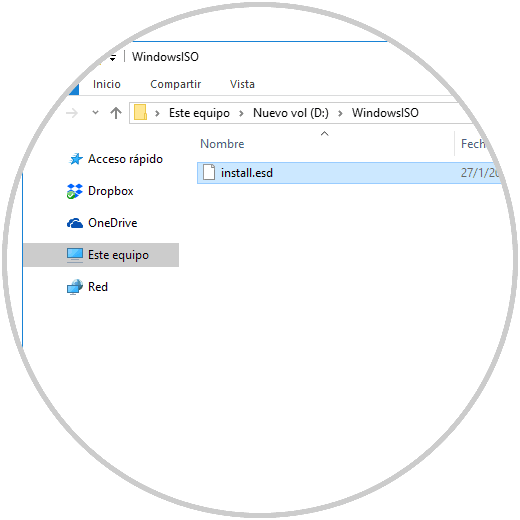 D:\WindowsISOAhora, vamos a copiar el contenido de X:\Sources\install.esd en la carpeta que hemos creado donde X es la ruta donde se encuentra el archivo install.esd: