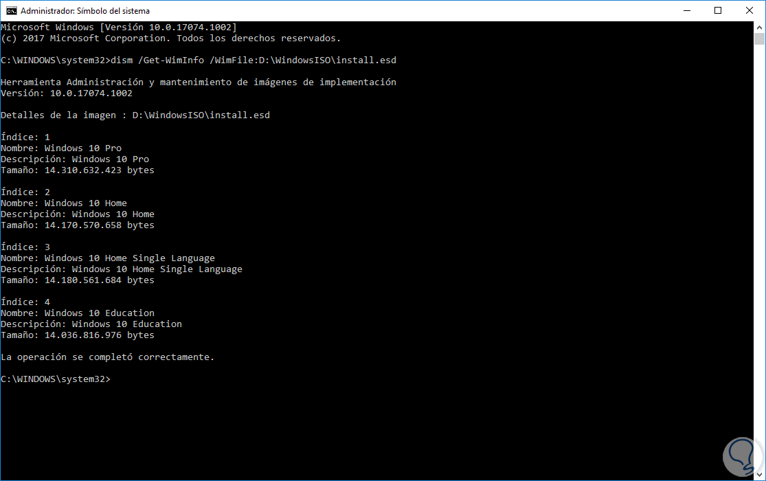 dism /Get-WimInfo /WimFile:D:\WindowsISO\Sources\install.esdAl pulsar Enter veremos lo siguiente:
