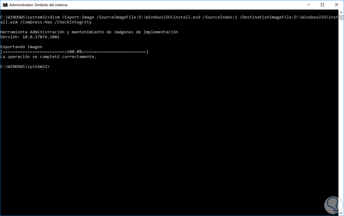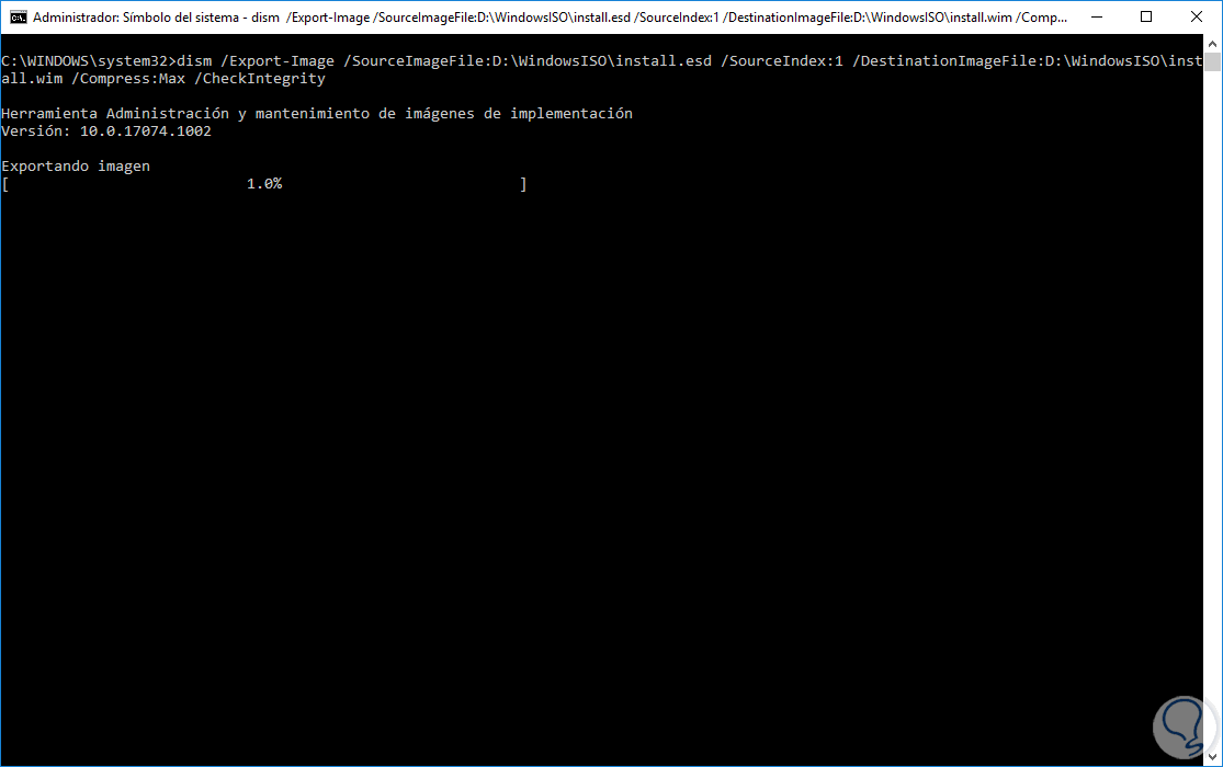 dism /Export-Image /SourceImageFile:D:\WindowsISO\install.esd /SourceIndex:1 /DestinationImageFile:D:\WindowsISO\install.wim /Compress:Max /CheckIntegrityVeremos lo siguiente: