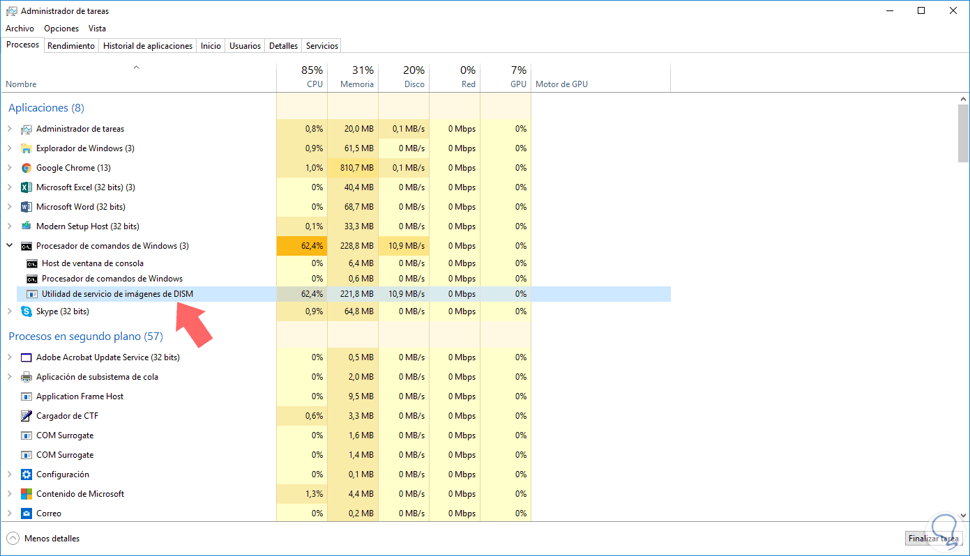 Durante este proceso podemos notar algo de lentitud en el sistema y esto es debido al uso de recursos que DISM hace en el sistema: