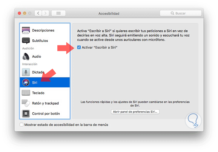 Ahora tenemos que seleccionar en esta nueva pestaña en el lateral derecho la aplicación de “Siri”. En este apartado tenemos que marcar la casilla de Activar “escribir para Siri”