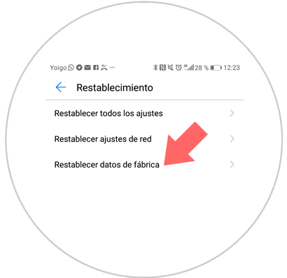 Dentro de esta opción verás 3 posibles acciones a realizar. Pulsa sobre la tercera: "Restablecer datos de fábrica".