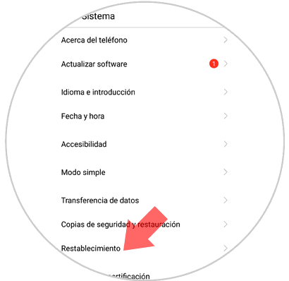 Una vez dentro de esta opción desliza hacia abajo hasta que encuentres la opción “Restablecimiento” y pulsa sobre ella.