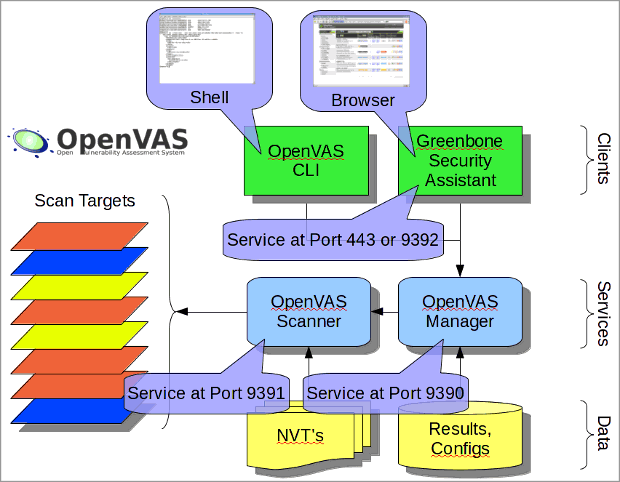 OpenVAS es gratuito ya que está bajo la Licencia Pública General de GNU (GNU GPL). A nivel de arquitectura, OpenVAS ejecuta de manera eficaz las Pruebas de vulnerabilidad de red (NVT) con una estructura similar a esta: