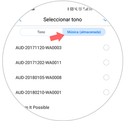 Si quieres seleccionar una canción o un audio que tengas guardado en tu teléfono desliza la barra superior de la pantalla a la opción “Música” y aquí aparecerán audios y canciones que tengas guardado en la memoria de tu teléfono. Selecciona el que más te guste para elegirlo como tono de despertador.