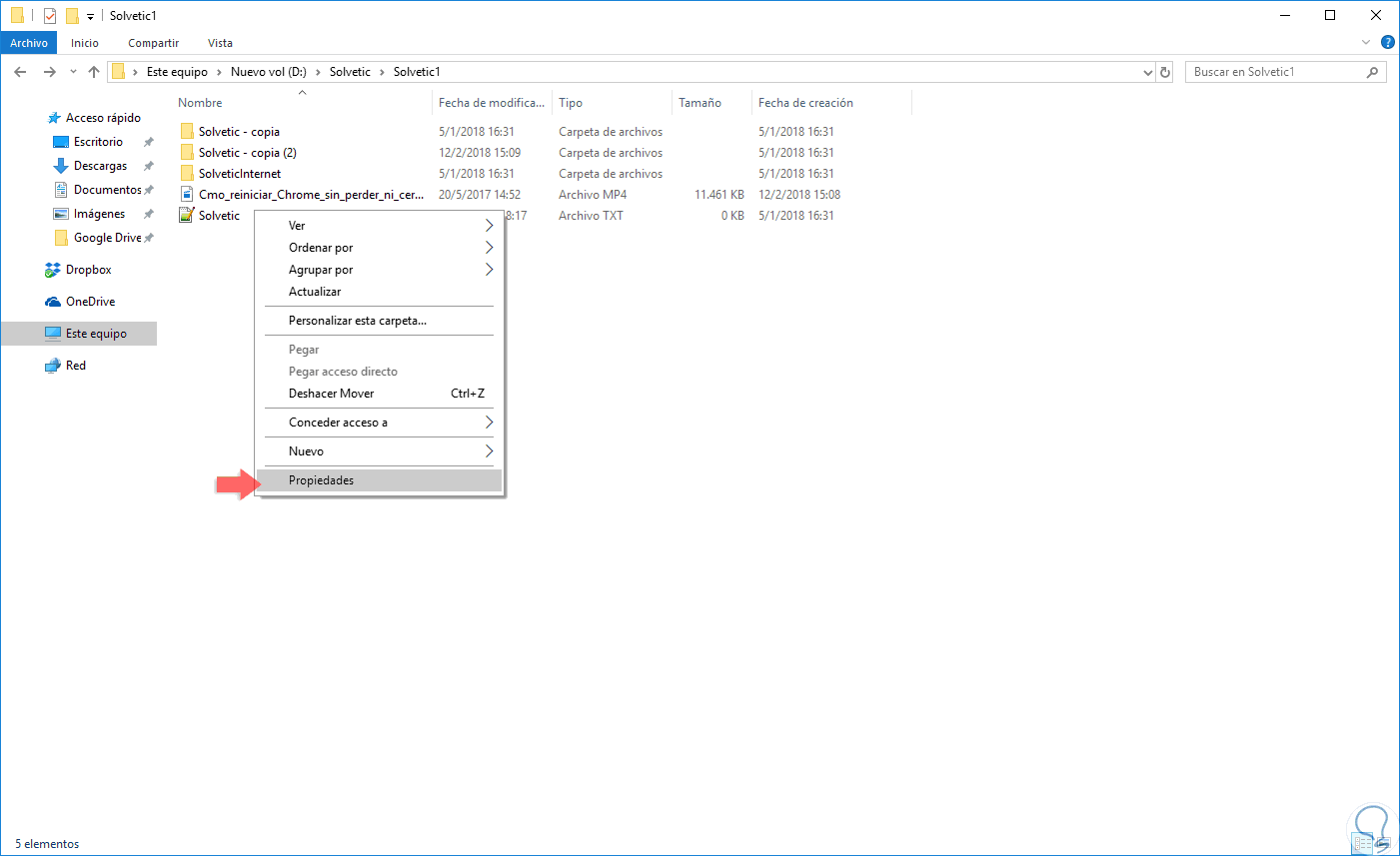 La primera opción disponible para ver en detalle la fecha de modificación de un archivo es dando clic derecho sobre él y seleccionar la opción “Propiedades”: