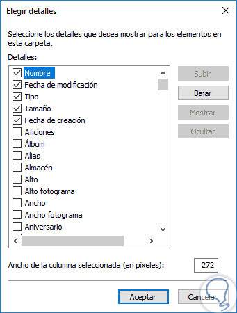 Podemos dar clic sobre las opciones en la parte superior, pero se limitan a 7 opciones únicamente. Al pulsar en la línea “Elegir columnas” veremos lo siguiente. Allí tendremos más de 30 opciones y además será posible definir el orden de visualización en el explorador usando los botones Bajar o Subir.