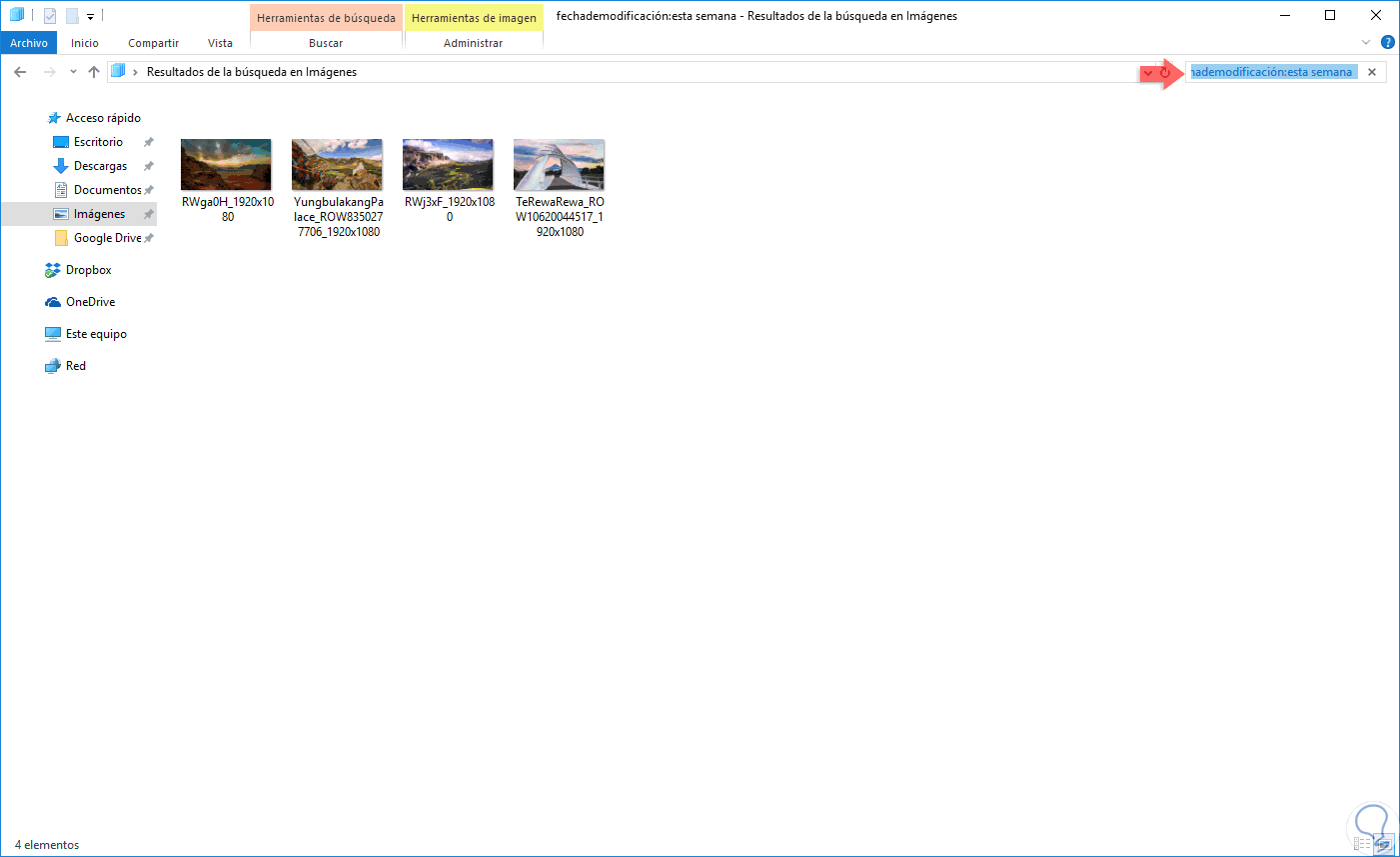 En este caso hemos seleccionado Imágenes y por ello aparece la opción “Buscar en Imágenes” y en el menú del explorador, cuando demos clic en dicho campo de búsqueda, podemos ver un nuevo menú llamado “Buscar” el cual nos ofrece las siguientes opciones: