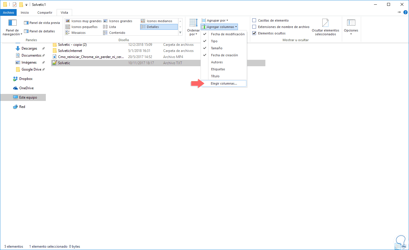 Como hemos indicado anteriormente, podemos añadir más columnas a la vista en el Explorador de archivos ya que por defecto solo trae 2 o 3 columnas, para realizar este proceso, vamos al menú