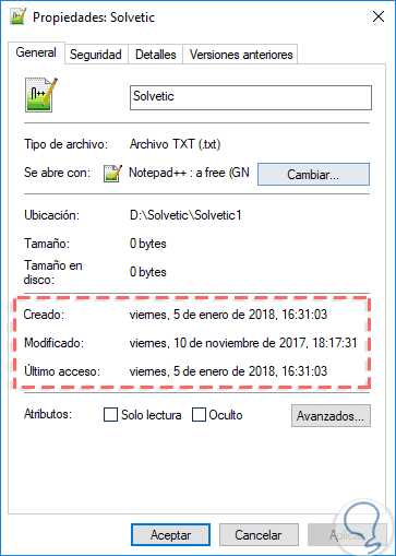 Al acceder a la ventana de las propiedades veremos en la parte inferior detalles como creación, modificación y ultimo acceso: