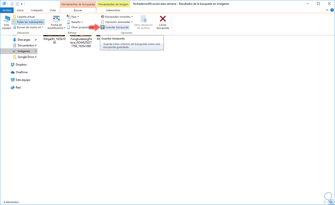 Basta con dar clic sobre el día y se aplicará dicho filtro. El explorador de Windows nos da la oportunidad de guardar las búsquedas con parámetros para que en un futuro requerimiento esté allí sin repetir todo el proceso, para esto, vamos al menú “Buscar” y allí damos clic en la opción “Guardar búsqueda”: