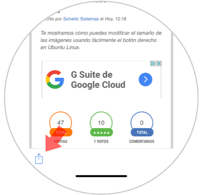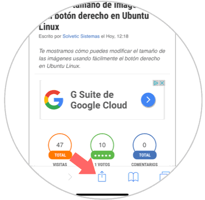 Lo primero que tenemos que hacer es entrar en aquella web la cual queremos convertir en PDF. Una vez aquí, tenemos que seleccionar el icono de compartir situado en la parte inferior del menú.