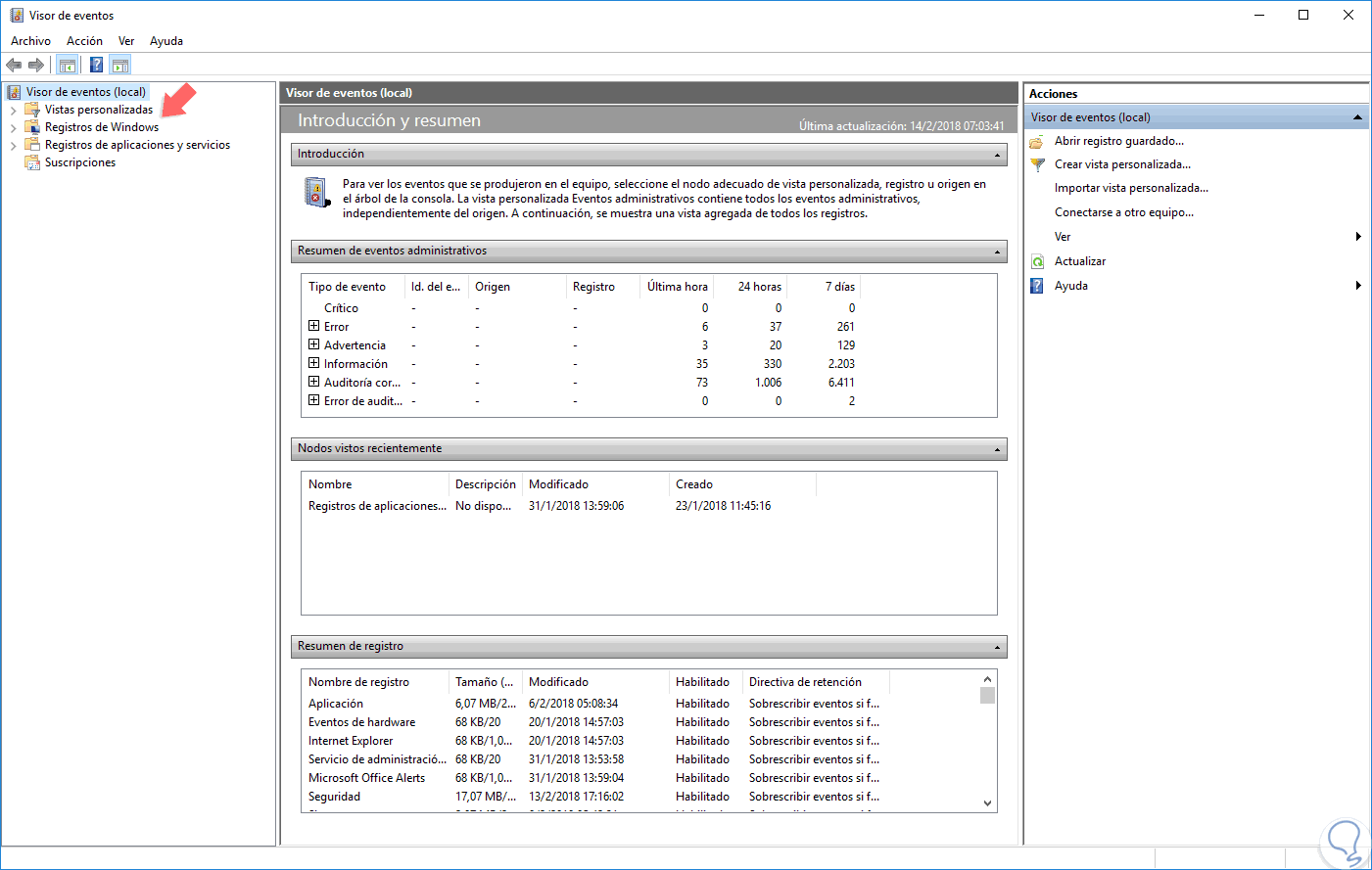 Una vez accedamos al Visor de eventos veremos lo siguiente: