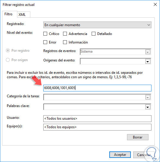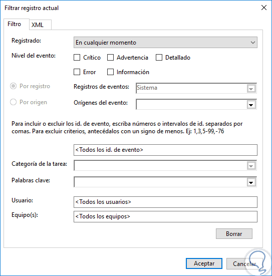 En el costado derecho pulsamos sobre la línea “Filtrar registro actual” y será desplegada la siguiente ventana: