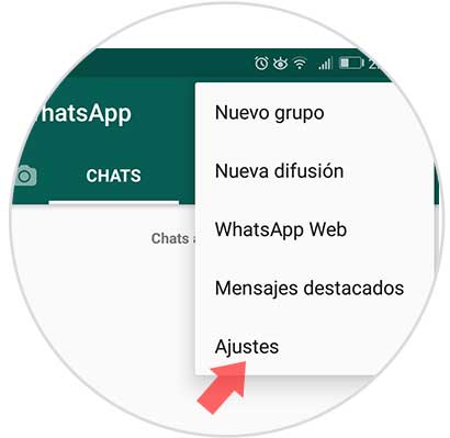 Para ver la opción de fecha y hora de conexión, tanto nosotros como el usuario debe tener activa dicha opción, para verificar esto pulsamos en el icono de menú de WhatsApp y allí seleccionamos la línea Ajustes: