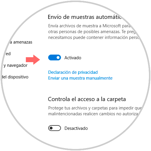 Pulsamos en la línea “Configuración de antivirus y protección contra amenazas” y será desplegado lo siguiente: