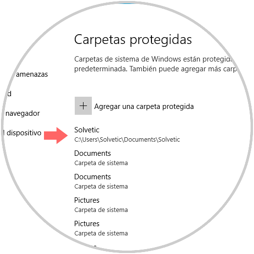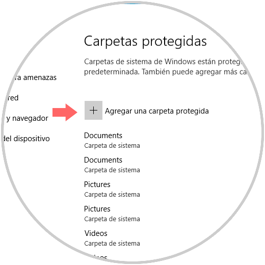 Allí pulsamos en el botón “Agregar una carpeta protegida” y en la ventana desplegada seleccionaremos la carpeta a proteger: